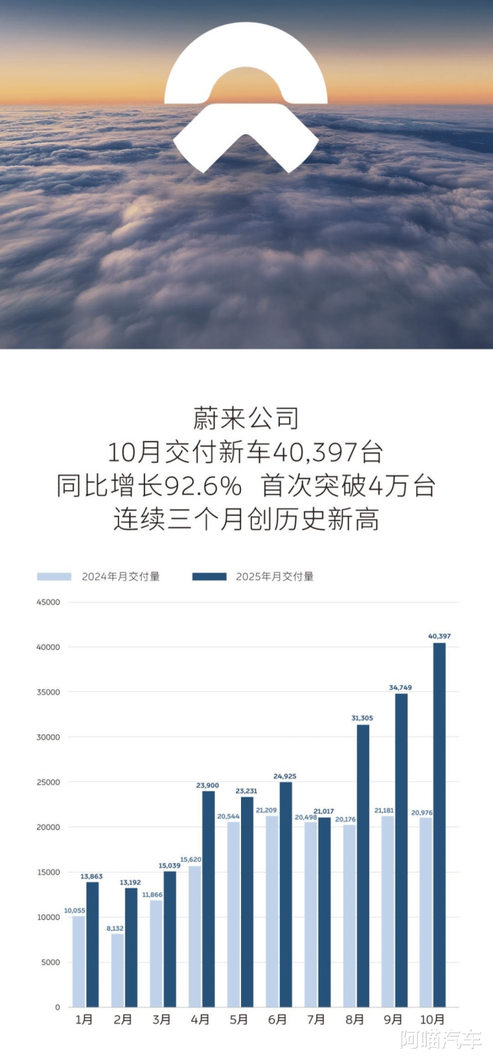 蔚来公司10月交付新车40,397台,同比增长92.6%,首次突破四万台。具体来看,蔚来品牌交付17,143台,乐道品牌交付17,342台,firefly萤火虫品牌交付5,912台,三大品牌均创下交付新高。主力军是新款的蔚来ES8和乐道L90,都是主打性价比的产品。可以说蔚来现在是真的想明白了,只有先活下来才有机会说未来。